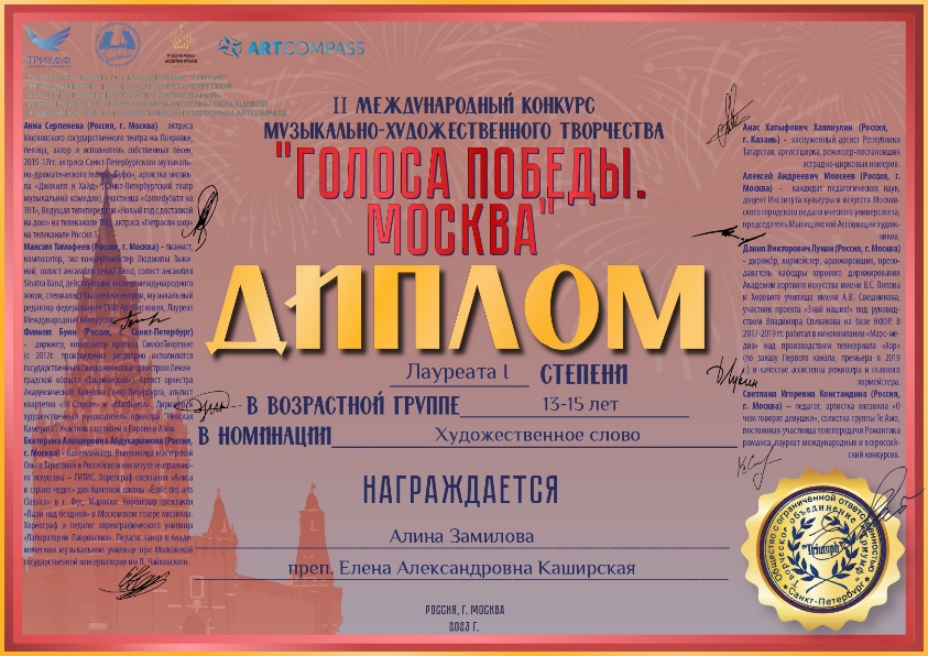 Пронзительное и трогательное исполнение стихотворения Булата Окуджавы «До свидания, мальчики» принесло Алине Диплом Лауреата 1 степени.