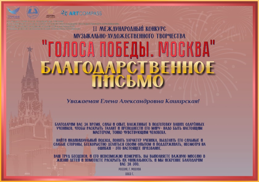 Елена Александровна Каширская – руководитель ОДТО «Своя радуга» награждена благодарственным письмом.