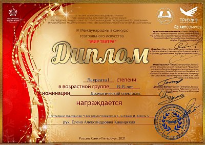 Воспитанники Каширской Елены Александровны добились серьезной победы в Международном конкурсе театрального искусства «Мир театра». На суд компетентного жюри была представлена постановка сказки «Суп из топора». В результате юные артисты- лауреаты 1 степени. Поздравляем!