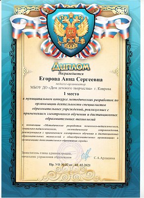 Поздравляем педагога- организатора МБОУ ДО ДДТ Егорову Анну Сергеевну с победой в муниципальном конкурсе методических разработок по организации деятельности специалистов образовательных учреждений, реализуемых с применением электронного обучения и дистанционных образовательных технологий в номинации «Методические разработки психолого- педагогического, логопедического сопровождения, реализующиеся с применением электронного обучения и дистанционных образовательных технологий в образовательных организациях и учреждениях дополнительного образования».