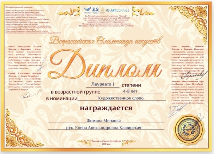 Меланья занимается в ДДТ первый год, но уже имеет первые успехи на сцене. Её прочтение весёлой и поучительной сказки Дональда Биссета «Орёл и овечка» высококомпетентное жюри отметили Дипломом лауреата I степени!