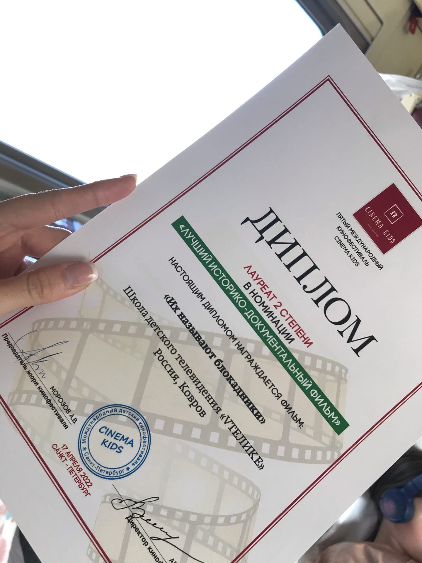 Воспитанники объединения «Юный блогер» МБОУ ДО «Дом детского творчества» совместно со школой детского телевидения «VТЕЛИКЕ» стали лауреатами 2 степени в номинации «Лучшее историко-документальное кино» Международного кинофестиваля «CINEMA KIDS».