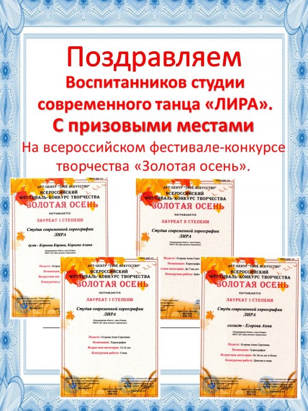 Поздравляем воспитанников студии современного танца «ЛИРА» с призовыми местами на всероссийском фестивале-конкурсе творчества «Золотая осень».