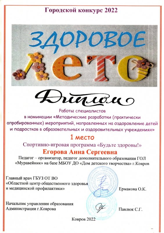 «Здоровое лето» - именно так назывался городской конкурс на лучшую творческую работу по пропаганде здорового образа жизни среди детских оздоровительных лагерей. Педагог Дома детского творчества Егорова Анна Сергеевна приняла участие в конкурсе в номинации «Методические разработки».