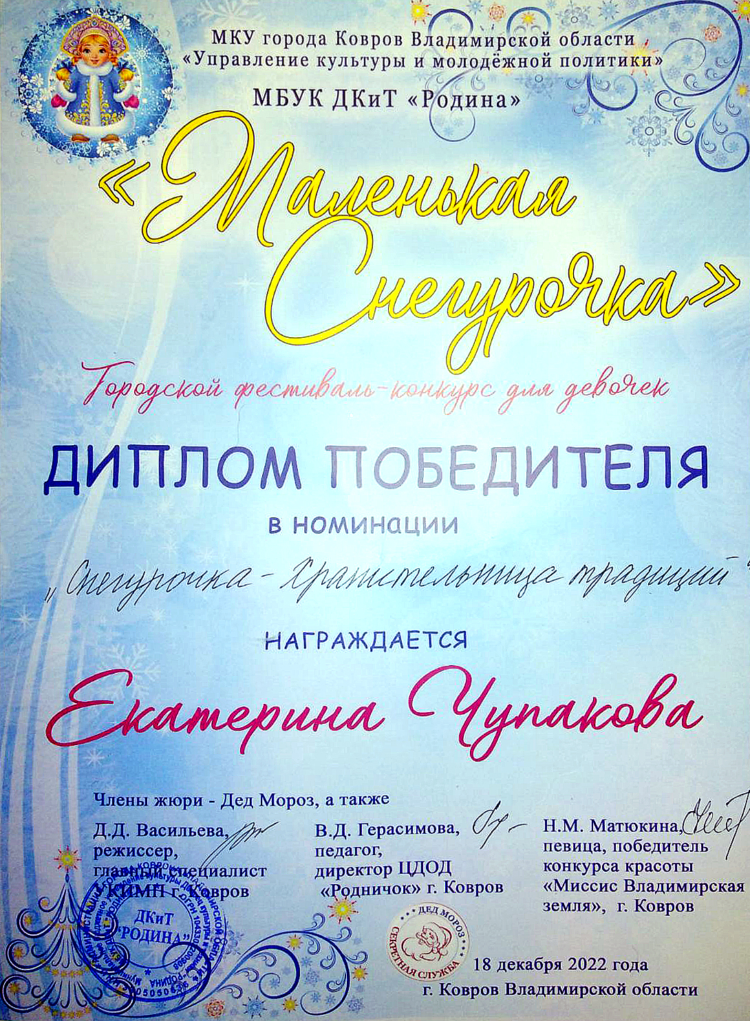 Поздравляем воспитанницу ДДТ Чупакову Катю с удачным участием в конкурсе «Маленькая Снегурочка».