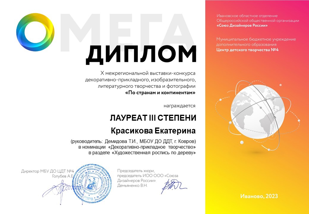 В конце декабря-начале января 2023 г. состоялась X межрегиональная выставка-конкурс декоративно-прикладного, изобразительного, литературного творчества и фотографии «По странам и континентам» (г. Иваново) . По традиции в ней приняли участие и воспитанники Дома детского творчества.