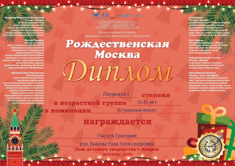 Новый 2021 год стал успешным для юного вокалиста ДДТ из объединения «Сольное пение» Сысуева Григория (педагог Быкова Рада Александровна). Компетентное жюри отметило высокий уровень профессионализма Григория В период зимних каникул начинающий артист выступал в Москве в караоке клубе «Чикаго» в рамках фестиваля «Лестница к славе».