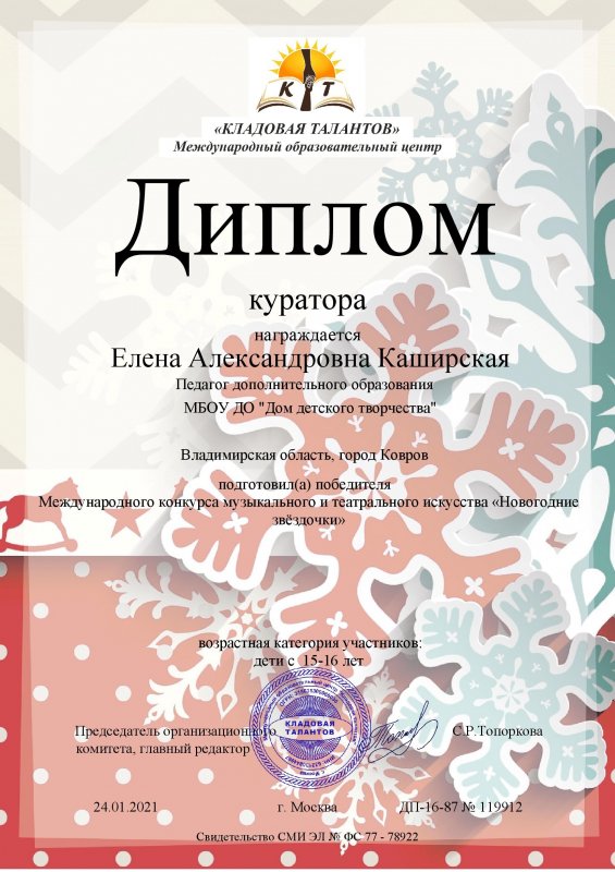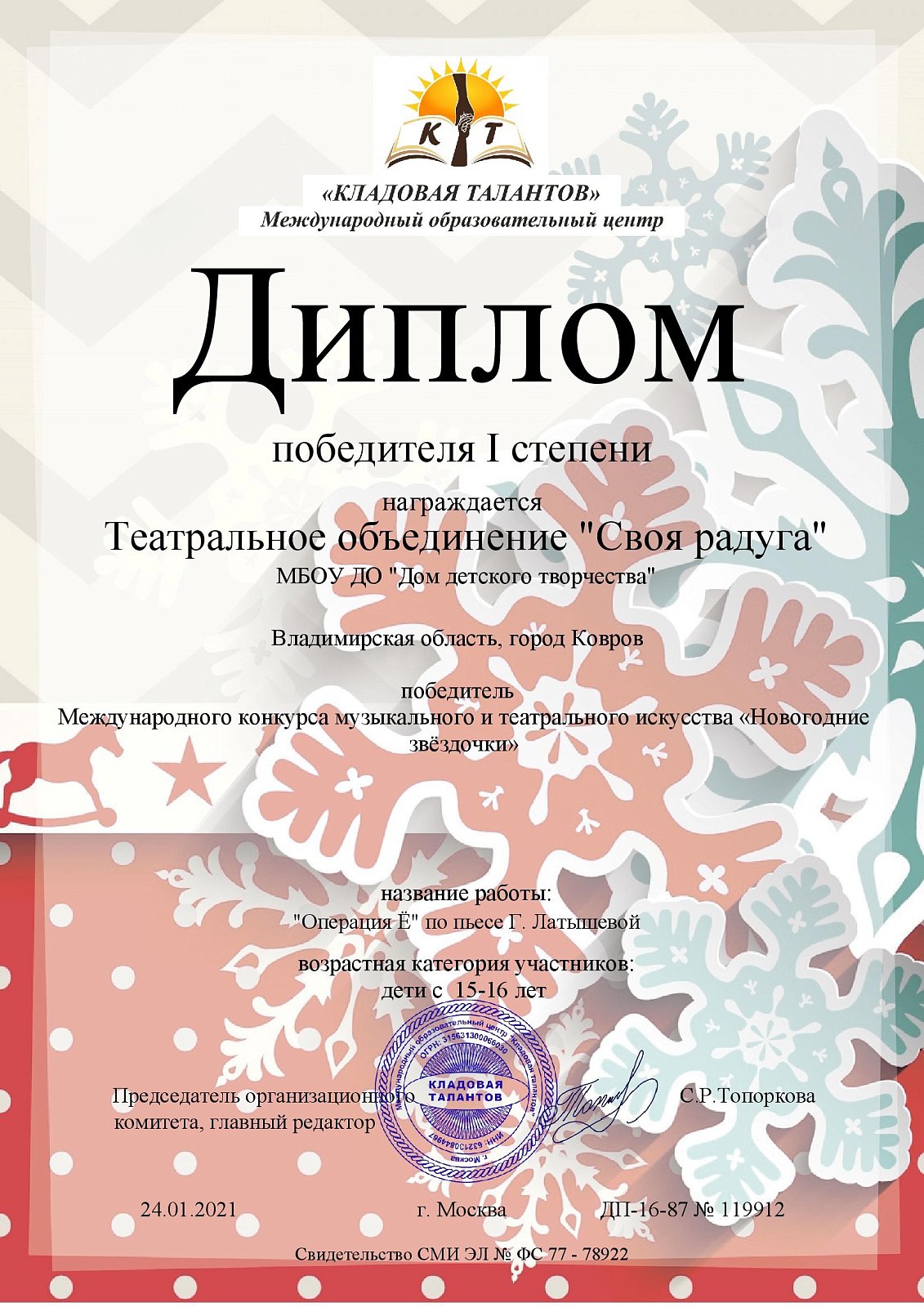 Очередную победу в международном конкурсе музыкального и театрального искусства «Новогодние звездочки» одержали воспитанники объединения «Своя радуга» . Ребята, которые занимаются театральной деятельностью под руководством Каширской Елены Александровны, стали победителями и получили диплом первой степени. Жюри высоко оценило новогоднюю сказку «Операция Ё». Впереди у коллектива большие планы. Ждем новых театральных работ!