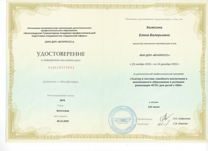 С января 2021 года в МБОУ ДО ДДТ начал свою работу педагог-тьютор Колесина Алена Валерьевна, которая имеет сертифицированное удостоверение о повышении квалификации по программе «Тьютор в системе семейного и инклюзивного образования в условиях реализации ФГОС для детей с ОВЗ»